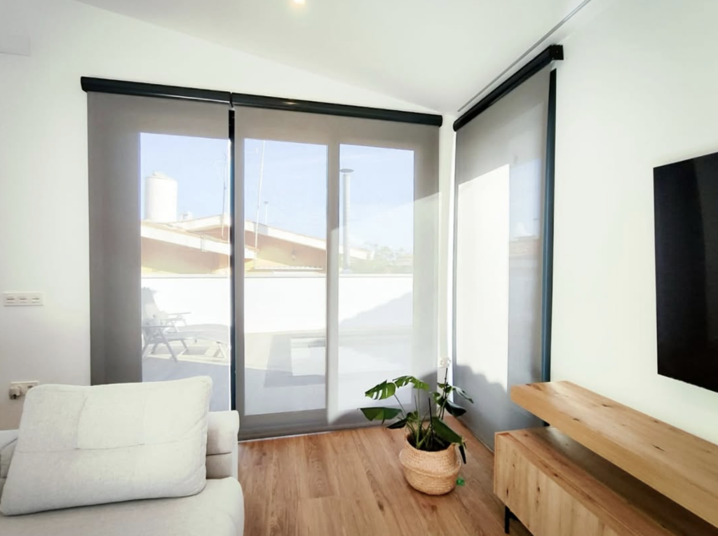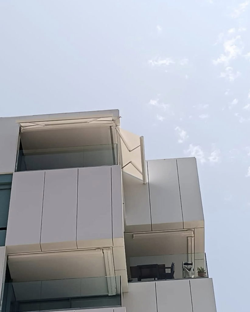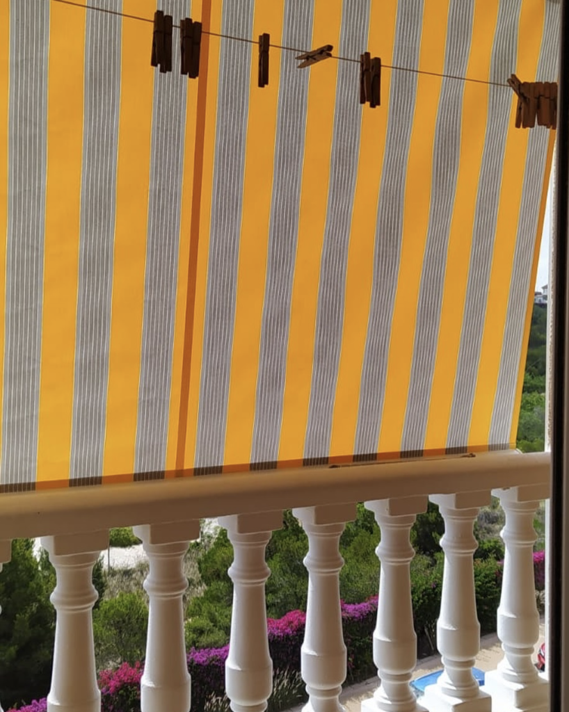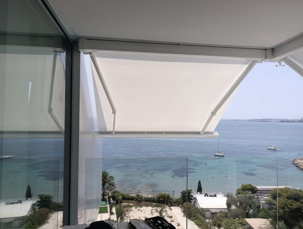 Cofre blanco lacado con lona acrílica beige. Instalación en vivienda unifamiliar. Motor Somfy con sensor de viento.