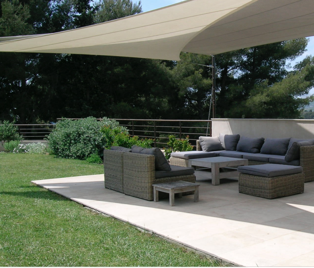 Sombra tensada en terraza exterior de restaurante. Color arena, tejido microperforado técnico de alta resistencia.