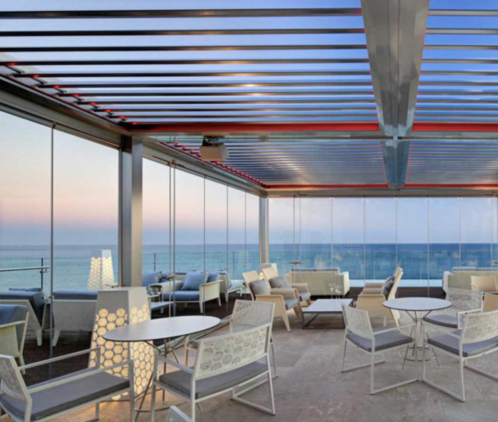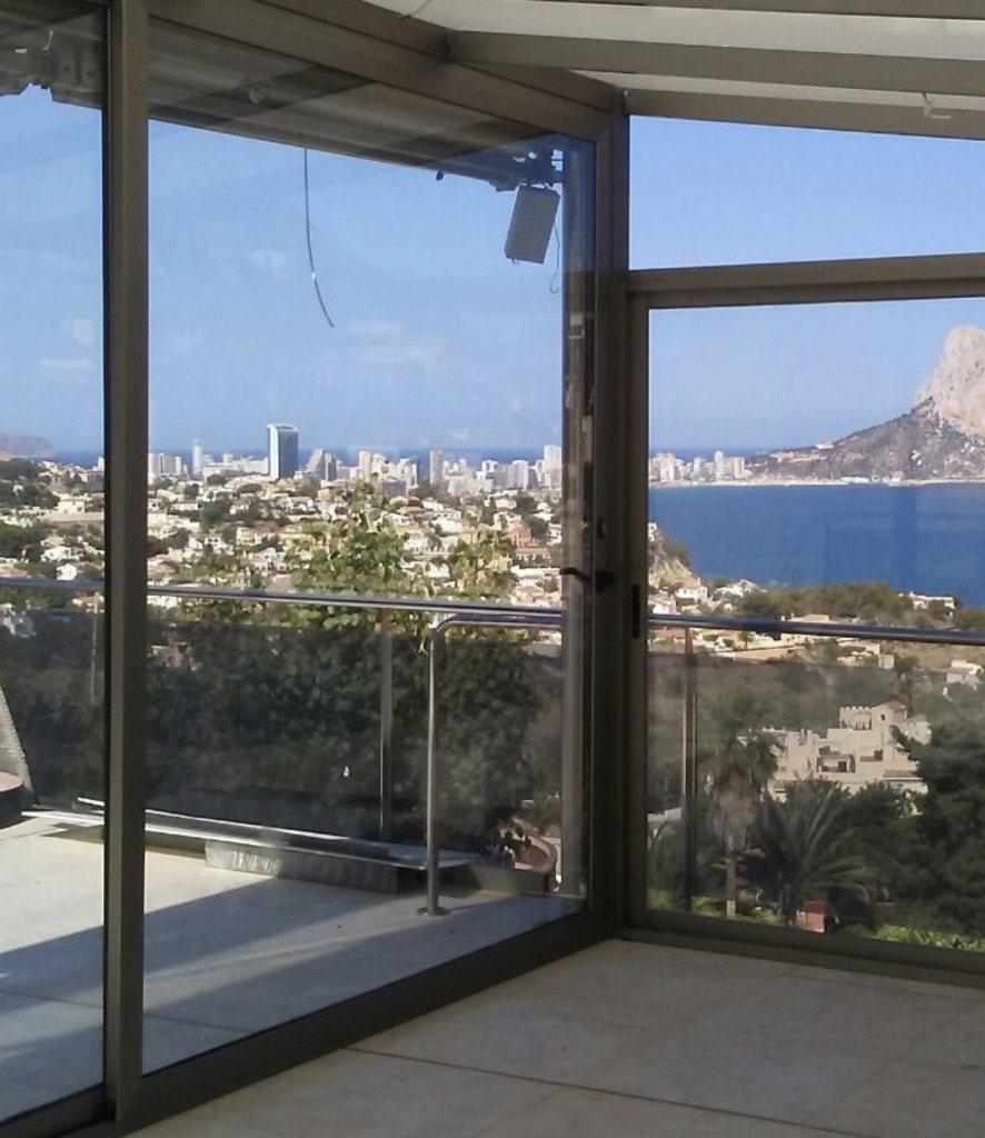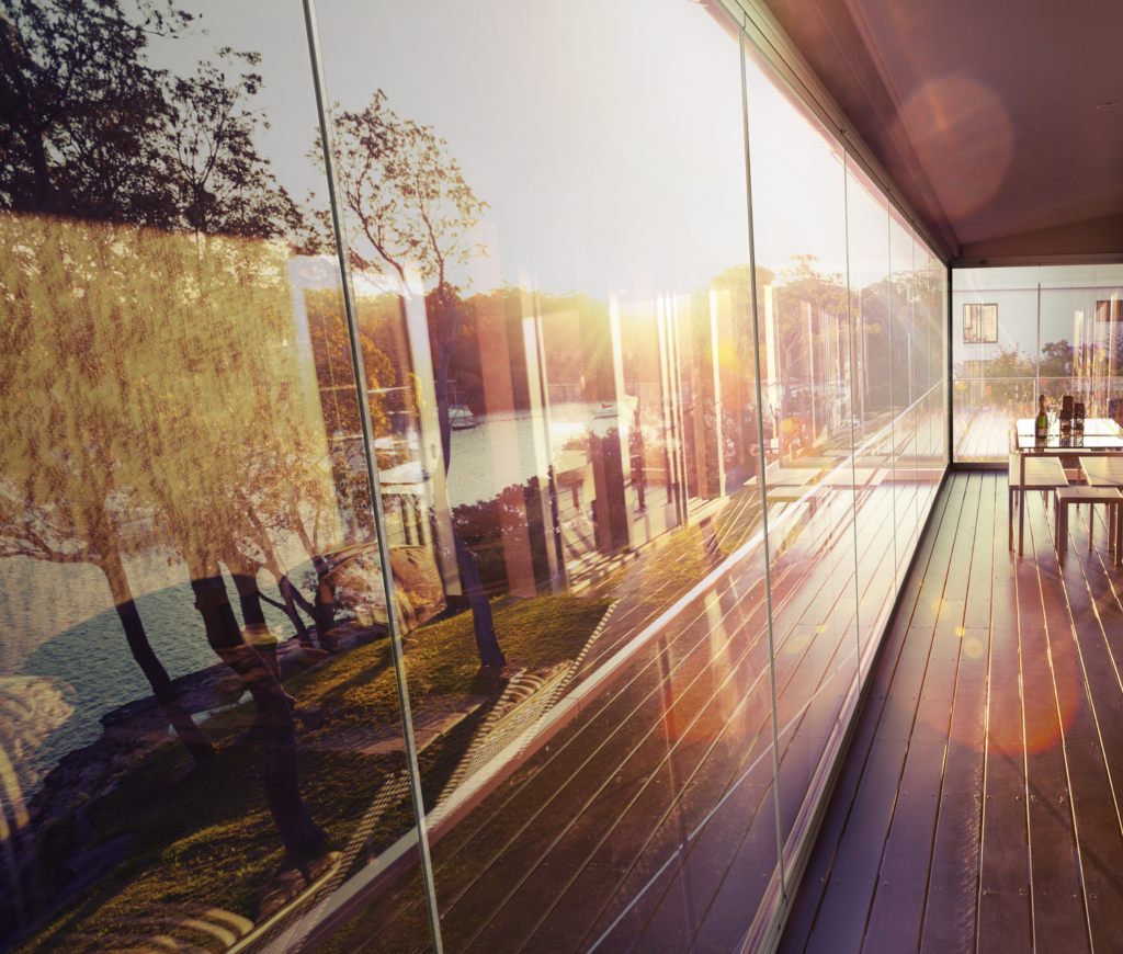 Cierre sin perfiles de terraza acristalada. Protección frente al viento y vistas sin obstáculos. Instalación deslizante con apertura lateral.